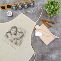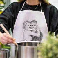 Laden Sie einfach Ihr Foto hoch und erhalten Sie eine fein ausgearbeitete Bleistiftzeichnung, die exklusiv auf Ihre Schürze gedruckt wird. Die elegante Schwarz-Weiß-Optik verleiht dem Motiv eine zeitlose, hochwertige Ausstrahlung und macht jede Schürze zu einem einzigartigen Einzelstück – modern, praktisch und voller Persönlichkeit.